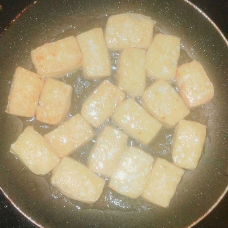 Đầu tiên, bạn bắc chảo chống dính lên bếp rồi cho 100ml dầu ăn vào. Khi dầu nóng già thì thả đậu hũ đã sơ chế vào, để ở mức lửa vừa và chiên vàng đều các mặt, chiên xong thì vớt ra đĩa.